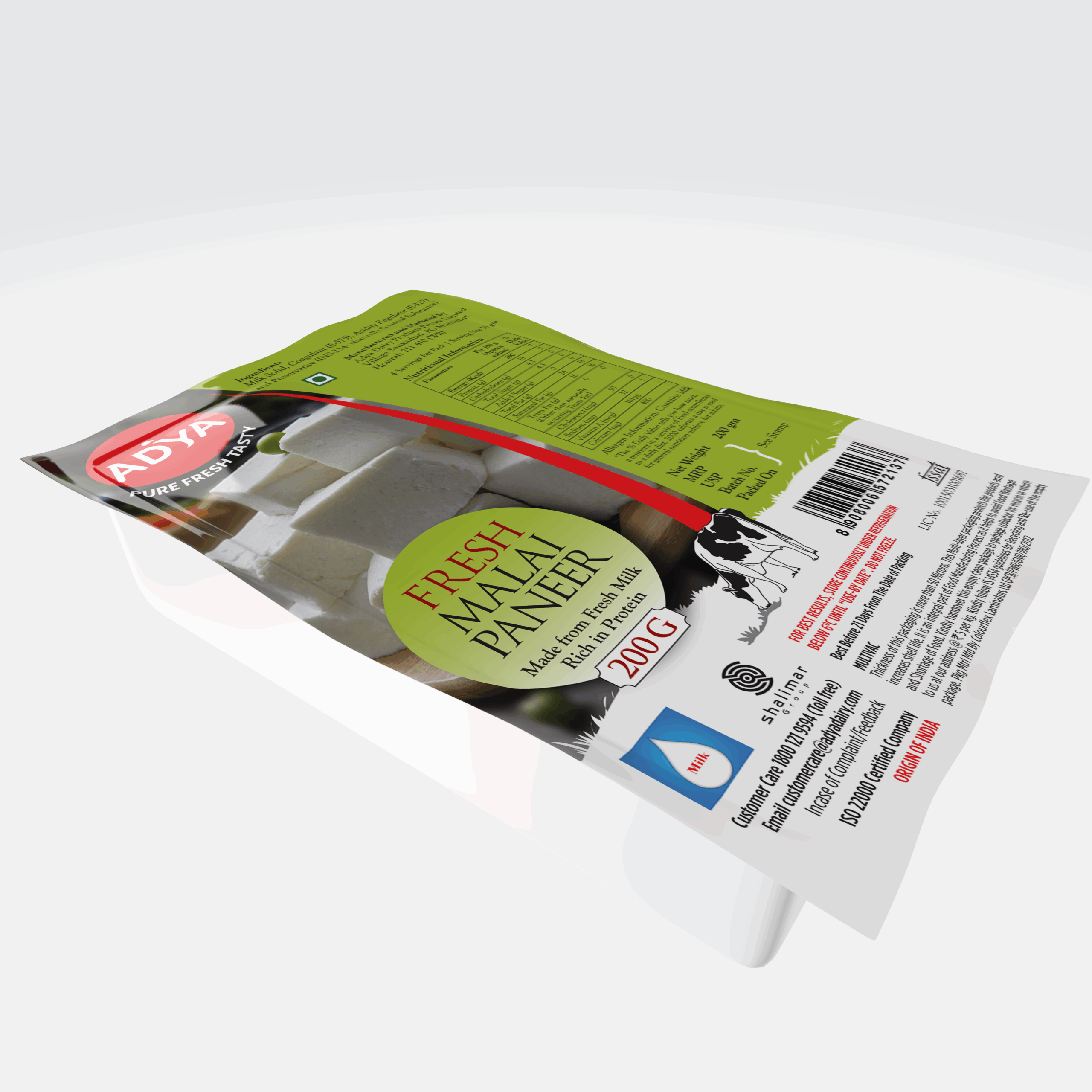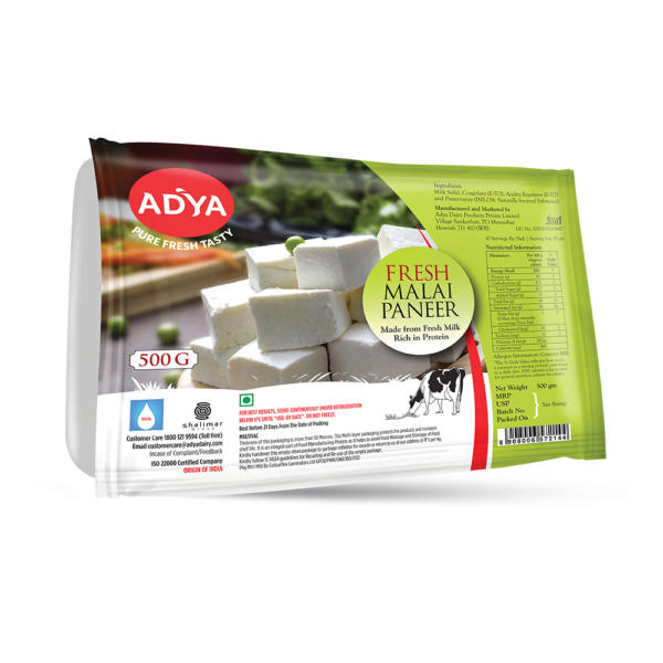 Rich in malai, Adya Dairy Fresh Malai Paneer makes every dish delicious. Every pack is power-packed with high energy, protein and minerals that keeps one up and running. Packed in specialised thermoform packs with the help of imported machines from Germany, the product has a shelf life of 21 days.